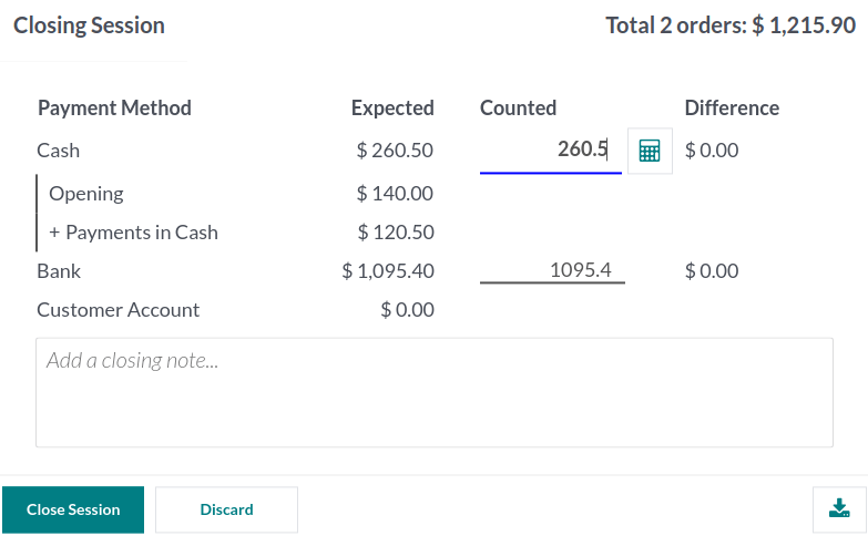 Antes de cerrar esta ventana, haga clic en el icono de calculadora para contar su efectivo. Se abrirá una ventana emergente en donde se calculará la cantidad total en la caja registradora dependiendo de las monedas y billetes que se contaron y se sumaron de manera manual. Después, haga clic en Confirmar o en Descartar para cerrar la venta. La cantidad calculada estará en la columna Contado y los Detalles monetarios se especifican en la sección de Notas.